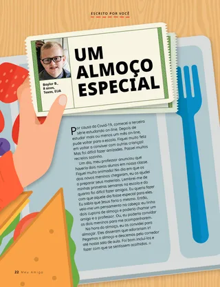 Um dia, meu professor anunciou que haveria dois novos alunos em nossa classe. Fiquei muito animado! No dia em que os dois novos meninos chegaram, eu os ajudei a preparar seus materiais. Lembrei-me de minhas primeiras semanas na escola e do quanto foi difícil fazer amigos. Eu queria fazer com que aquele dia fosse especial para eles. Eu sabia que Jesus faria o mesmo. Então, veio-me um pensamento na cabeça: eu tinha dois cupons de almoço e poderia chamar um amigo e o professor. Ou, eu poderia convidar os dois meninos para me acompanharem.