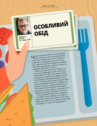 Через пандемію COVID-19 я почав навчатися у третьому класі в онлайн-режимі. Приблизно через місяць такого навчання я мав змогу повернутися до школи. Мені було радісно знову бути серед інших дітей! Але знайти друзів було нелегко. Я не раз на перервах залишався на самоті.