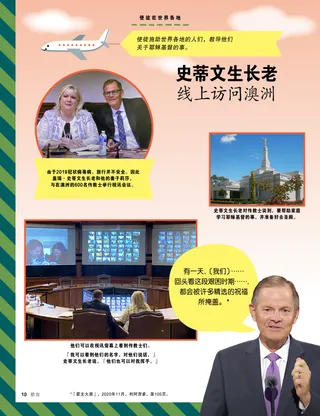 使徒在世界各地 史蒂文生长老线上访问澳洲 使徒施助世界各地的人们,教导他们关于耶稣基督的事。 由于2019冠状病毒病,旅行并不安全。因此盖瑞·史蒂文生长老和他的妻子莉莎,与在澳洲的600名传教士举行视讯会议。 史蒂文生长老对传教士谈到,要帮助家庭学习耶稣基督的事,并准备好去圣殿。 他们可以在视讯萤幕上看到传教士们。 「我可以看到他们的名字,对他们说话,」史蒂文生长老说,「他们也可以对我挥手。」