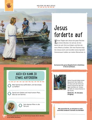 Eines Tages sah Jesus ein paar Fischer in ihren Booten. Er rief sie. Er forderte sie auf, ihm zu folgen und bei seinem Werk zu helfen. Die vier Fischer folgten Jesus nach und wurden seine Apostel. Gemeinsam halfen sie vielen Menschen.
