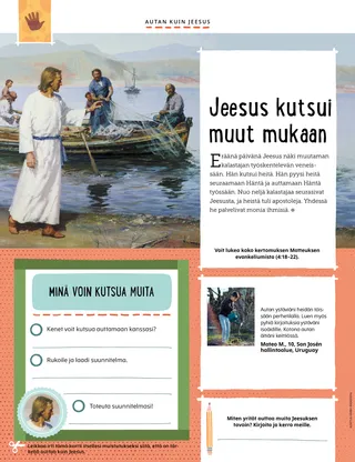 Eräänä päivänä Jeesus näki muutaman kalastajan työskentelevän veneissään. Hän kutsui heitä. Hän pyysi heitä seuraamaan Häntä ja auttamaan Häntä työssään. Nuo neljä kalastajaa seurasivat Jeesusta, ja heistä tuli apostoleja. Yhdessä he palvelivat monia ihmisiä.