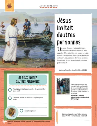 Un jour, Jésus a vu des pêcheurs travailler sur leurs bateaux. Il les a appelés. Il les a invités à le suivre et à participer à son œuvre. Les quatre pêcheurs ont suivi Jésus et sont devenus apôtres. Ensemble, ils ont servi de nombreuses personnes.