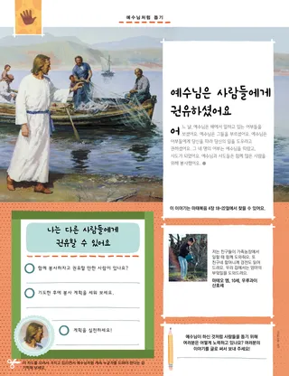 예수님처럼 돕기 예수님은 사람들에게 권유하셨어요 어느 날, 예수님은 배에서 일하고 있는 어부들을 보셨어요. 예수님은 그들을 부르셨어요. 예수님은 어부들에게 당신을 따라 당신의 일을 도우라고 권하셨어요. 그 네 명의 어부는 예수님을 따랐고, 사도가 되었어요. 예수님과 사도들은 함께 많은 사람을 위해 봉사했어요. 저는 친구들이 가족농장에서 일할 때 함께 도와줘요. 또 친구네 할머니께 경전도 읽어 드려요. 우리 집에서는 엄마의 부엌일을 도와드려요. 마테오 엠, 10세, 우루과이 산호세 삽화: 해리 앤더슨