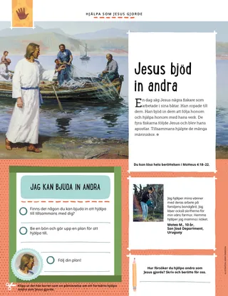 En dag såg Jesus några fiskare som arbetade i sina båtar. Han ropade till dem. Han bjöd in dem att följa honom och hjälpa honom med hans verk. De fyra fiskarna följde Jesus och blev hans apostlar. Tillsammans hjälpte de många människor.