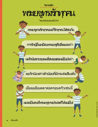 ร้อยกรองลีลา พระเยซูทรงรักทุกคน โดย จอร์แดน มอนสัน ไรท์ พระเยซูทรงรักทุกคน ผมก็รักทุกคนได้เช่นกัน การรักผู้อื่นเหมือนพระเยซูคือสิ่งผมจะทำ ผมรักน้องชายของผมที่เล่นของเล่นผมเป็นประจำ ผมรักน้องสาวตัวน้อยที่มักจะส่งเสียงดัง เมื่อผมมีเมตตาต่อครอบครัวเช่นนี้ ผมจะเป็นคนที่พระเยซูทรงประสงค์ให้ผมเป็น! ภาพประกอบโดย จอย เนวาดา