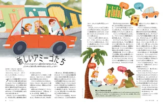 ブリジットもほほえんで木を指し,「ツリー」と言いました。ブリジットは顔をかがやかせながらほかの物を指し,それを英語で言いました。ダイアナとアンドレアはその英語の言葉をくり返しました。それから二人は,スペイン語では何と言うのかをブリジットに教えてくれました。ブリジットはリブロ(本),カーサ(家),コチェ(車)など,いろいろな役に立つ言葉を学びました。特によかったのは,二人がアミーゴ(友達)という言い方を教えてくれたことでした。
