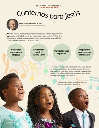 Cuando cantes, piensa en lo que dicen las palabras de la canción. Cuando sientas la tentación de tomar una mala decisión, intenta tararear una canción de la Primaria. Al cantar, te sentirás más cerca de nuestro Padre Celestial y de Jesucristo.