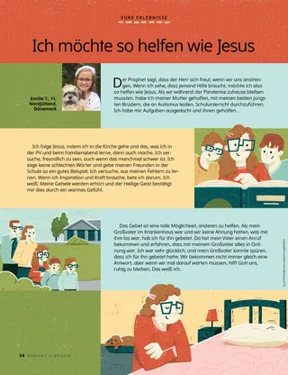 Ich folge Jesus, indem ich in die Kirche gehe und das, was ich in der PV und beim Familienabend lerne, dann auch mache. Ich versuche, freundlich zu sein, auch wenn das manchmal schwer ist. Ich sage keine schlechten Wörter und gebe meinen Freunden in der Schule so ein gutes Beispiel. Ich versuche, aus meinen Fehlern zu lernen. Wenn ich Inspiration und Kraft brauche, bete ich darum. Ich weiß: Meine Gebete werden erhört und der Heilige Geist bestätigt mir dies durch ein warmes Gefühl.