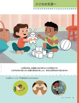 2021年9月号 愛するフレンド(お友達)のみなさんキリストによって平安を見いだすことについてのメッセージを読みましょう。 ダリン・H・オークス管長イエスのために歌うわたしたちはどのように音楽で救い主に愛をしめせるでしょうか。そのことについて,ダリン・H・オークス管長のメッセージを読みましょう。 エイミー・ジェーン・レビット新しいアミーゴたちブリジットはスペイン語を話せませんが,二人の女の子のおかげで自分はかんげいされていると感じました。 楽しい聖文の時間これらの活動やアイデアを使って,家族と一緒に『わたしに従ってきなさい』を研究しましょう。 ジュリアン・ドーマンすてきなところを言うジョナサンの家族は関係がうまくいっていません。けれども,ジョナサンには家庭の夕べのための新しいアイデアがあります。すてきなところを言うのです! スティーブンソン長老がオーストラリアをオンラインで訪問する新型コロナウイルス感染症のパンデミックの間,スティーブンソン長老がオーストラリアの宣教師にデジタルでミニスタリングを行います。 見つけよう!絵の中にかくされたものを見つけられますか? アメリカ合衆国のエレナーをしょうかいしますアメリカ合衆国のエレナーをしょうかいします。エレナーがどのようにしてイエスのように人を助けているか見てみましょう。 イエスは人々をまねかれましたイエスがどのように人々をまねかれたか,そのお話を読んで,イエスのように奉仕するための計画を立てましょう。 マルゴとパオロとアメリカ合衆国でぼうけんマルゴとパオロと一緒にアメリカ合衆国について学び,ヘルピングハンズのチャレンジに挑戦しましょう。 エライザ・ブロードベントいちばんの選択ネイサンは安息日を聖くたもち,日曜日の大会に参加しないことを決めました。 教会れきしカードカードを集めて,教会歴史の重要な人たちについて学びましょう!今月は,デシデリア・ジャニェスとオリバス・ビラ・エオイです。 楽しい果物数字のヒントを使って,果物のパズルをときましょう。 エミリー・ヴェルナーキノコの教訓アニーはどれが安全か分かるようガイドの方と一緒にキノコをとります。その経験から,アニーはせいれいに耳をかたむけることについて学びます。 ベイラー・B,8才(アメリカ合衆国,テキサス州)特別なランチベイラーはクラスの新しい子たちをランチにさそうことで,その子たちをかんげいします。 詞・曲 ニック・デイ主の平安受け子供のための簡単な音楽 総大会ノート総大会に耳をかたむけながら,これらの活動を行いましょう! ジョニ・L・コッホ長老平安な気持ちコッホ長老は子供のころに,お父さんをなくしました。コッホ長老はすくいの計画について考えたとき,平安を感じました。 花を見つけましょう庭で花の組み合わせを見つけましょう。 ショー・アンド・テル(みんなの発表)世界中の子供たちの言葉や作品を集めています。 マットとマンディマットとマンディが信仰箇条の第10条について学びます。 年長の子供たちへ年長の子供たちのためのヒントとチャレンジ。 ルーシー・スティーブンソン・イーウェルキム・ホジクホジクはアメリカ合衆国で研究をしていたときに,福音について学びます。バプテスマを受け,韓国に福音をもたらすために努力します。 エミリー・T,11才(デンマーク,北ユラン)イエスのように助けるよう努力する自分がどのようにしてイエス・キリストにしたがうことを選んだかをエミリー・Tが語ります。 親切はわたしから始まります家,学校,教会でどのように親切になれるでしょうか? マリッサ・デニスわたしの側,あなたの側関係がうまく行っていない二人の姉妹が,自分たちの部屋をカーテンで仕切ります。けれども,二人はすぐにそれが必要ないことを学びます。 奉仕チャレンジ折り紙この折り紙を折って,イエスがなさったように奉仕しましょう。 小さなお友達へ ジェニファー・マディー友達との石けり友達が言い争いをしているとき,デイヤは平和をつくり出す人になります。 カートランド神殿カートランド神殿についてのお話を読み,神殿について学びましょう。 神殿はせいなる場所です福音を中心にしたぬり絵ページを使って,小さな子供たちを教えましょう。今月のメッセージは「神殿はせいなる場所です」です。 マリッサ・ウィディソン初等協会プログラムでの親切ポールの友達が初等協会プログラムにおくれて来たとき,ポールはその子がかんげいされていると感じられるようにします。 ジョーダン・モンソン・ライトイエスはみんなを愛しておられます「詩に合わせて動いてみよう」を通じて,イエスがされたように親切にして愛することを子供たちに教えましょう。 小さなお友達のための楽しい聖文の時間これらのアイデアを使って,子供たちと一緒に『わたしに従ってきなさい』を研究しましょう。 親愛なる親の皆さん家庭に愛と調和を生み出す方法に関する,親へのメッセージを読みましょう。