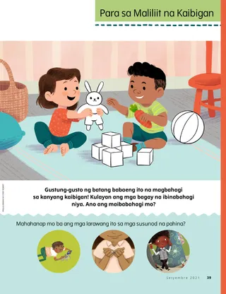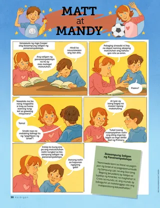 Setyembre 2021 Minamahal na mga KaibiganBasahin ang isang mensahe tungkol sa pagkakaroon ng kapayapaan kay Cristo. Dallin H. OaksPag-awit para kay JesusBasahin ang isang mensahe mula kay Pangulong Oaks kung paano natin maipapakita ang ating pagmamahal sa Tagapagligtas sa pamamagitan ng musika. Amie Jane LeavittMga Bagong Amigos [Kaibigan]Hindi nagsasalita ng wikang Espanyol si Brigit, pero dalawang batang babae ang nagpapadama sa kanya na tanggap siya. Masayang Oras sa Pag-aaral ng mga Banal na KasulatanGamitin ang mga aktibidad at ideyang ito sa pag-aaral ng Pumarito Ka, Sumunod Ka sa Akin kasama ang iyong pamilya. Juliann DomanPagsasabi ng Mabubuting BagayHindi nagkakasundo ang pamilya ni Jonathan. Ngunit may bago siyang ideya para sa home evening: ang pagsasabi ng magagandang bagay! Bumisita si Elder Stevenson nang Online sa AustraliaSa gitna ng pandemyang COVID-19, digital na nag-minister si Elder Stevenson sa mga missionary sa Australia. Hanapin Ito!Makikita ba ninyo ang mga bagay na nakatago sa larawang ito? Kilalanin si Eleanor mula sa USAKilalanin si Eleanor mula sa USA at alamin kung paano siya tumutulong na katulad ni Jesus. Inanyayahan ni Jesus ang IbaBasahin ang kuwento tungkol sa kung paano inanyayahan ni Jesus ang iba at bumuo ng plano na maglingkod na tulad ng ginawa Niya. Mga Pambihirang Karanasan sa USA Kasama sina Margo at PaoloAlamin ang tungkol sa USA kasama sina Margo at Paolo at gawin ang hamon ng Mga Matulunging Kamay. Eliza BroadbentAng Waging PagpiliNagpasiya si Nathan na panatilihing banal ang araw ng Sabbath at huwag makibahagi sa isang karera sa araw ng Linggo. Mga Kard ng Kasaysayan ng SimbahanMangolekta ng mga kard para malaman ang tungkol sa mahahalagang tao mula sa kasaysayan ng Simbahan! Sa buwang ito: sina Desideria Yáñez at Olivas Vila Aoy. Kasiyahan Gamit ang mga PrutasGamitin ang simbolong numero para malutas ang mga puzzle ng prutas. Emily WernerAng Aral ng KabutePumipili si Annie ng mga kabute gamit ang isang gabay para malaman kung alin sa mga ito ang ligtas. Itinuturo nito sa kanya ang tungkol sa pakikinig sa Espiritu Santo. Baylor B.Isang Espesyal na TanghalianMalugod na tinatanggap ni Baylor ang mga bagong bata sa kanyang klase sa pamamagitan ng pag-anyaya sa kanila na kumain ng tanghalian kasama niya. Nik DayKapayapaan kay CristoPinasimpleng sheet music para sa mga bata Notebook ng KumperensyaGawin ang mga aktibidad na ito habang nakikinig ka sa pangkalahatang kumperensya! Joni L. KochIsang Payapang PakiramdamNoong bata pa si Elder Koch, pumanaw ang kanyang ama. Nakadama siya ng kapayapaan nang inisip niya ang plano ng kaligtasan. Hanapin ang mga BulaklakHanapin ang mga huwaran ng mga bulaklak sa halamanan. Ipakita at IkuwentoIsang koleksyon ng mga sipi at sining ng mga bata mula sa iba’t ibang panig ng mundo. Matt at MandyNalaman nina Matt at Mandy ang tungkol sa ikasampung saligan ng pananampalataya. Para sa mga Mas Nakatatandang BataMga mungkahi at hamon para sa mga mas nakatatandang bata. Lucy Stevenson EwellKim Ho JikNalaman ni Ho Jik ang tungkol sa ebanghelyo habang nag-aaral siya sa USA. Nabinyagan siya at sinisikap na dalhin ang ebanghelyo sa Korea. Emilie T.Pagsisikap na Tumulong Gaya ni JesusNagbahagi si Emilie T. ng mga paraan kung paano niya pinipiling sundin si Jesucristo. Sa Akin Nagmumula ang KabaitanPaano ka magiging mabait sa tahanan, sa paaralan, at sa simbahan? Maryssa DennisAng Aking Panig, Ang Iyong PanigHinati ng dalawang magkapatid na hindi magkasundo ang kanilang kuwarto gamit ang isang kurtina. Ngunit di-nagtagal ay natutuhan nila na hindi nila ito kailangan. Origami ng Hamon sa PaglilingkodGawin ang sining na ito ng pagtutupi para makapaglingkod tulad ng ginawa ni Jesus. Para sa Maliliit na Kaibigan Jennifer MaddyPaglalaro ng Piko Kasama ang mga KaibiganKapag nagtatalo ang kanyang mga kaibigan, si Daya ang tagapamayapa. Ang Kirtland TempleMagbasa ng isang kuwento tungkol sa Kirtland Temple at alamin ang tungkol sa mga templo. Ang Templo ay Isang Banal na LugarTuruan ang inyong mga musmos gamit ang pahinang kukulayan na nakasentro sa ebanghelyo. Ang mensahe sa buwang ito ay, “Ang Templo ay isang banal na lugar.” Marissa WiddisonKabaitan sa Programa ng PrimaryNang nahuling dumating ang kaibigan ni Paul sa programa ng Primary, ipinadama sa kanya ni Paul na malugod siyang tinatanggap. Jordan Monson WrightMahal ni Jesus ang Lahat ng TaoTuruan ang inyong mga musmos kung paano maging mabait at mapagmahal tulad ng ginawa ni Jesus sa pamamagitan ng tulang may aksyon. Masayang Oras sa Pag-aaral ng mga Banal na Kasulatan para sa Maliliit na BataGamitin ang mga ideyang ito sa pag-aaral ng Pumarito Ka, Sumunod Ka sa Akin kasama ang inyong mga musmos. Minamahal Naming mga MagulangMagbasa ng mensahe para sa mga magulang kung paano lumikha ng pagmamahalan at pagkakasundo sa kanilang tahanan.
