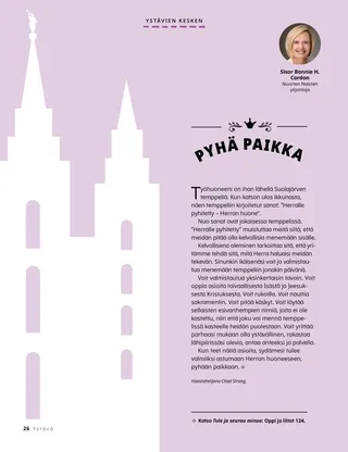 Työhuoneeni on ihan lähellä Suolajärven temppeliä. Kun katson ulos ikkunasta, näen temppeliin kirjoitetut sanat: ”Herralle pyhitetty – Herran huone”.