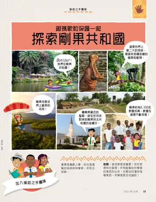 援助之手團隊 跟瑪歌和保羅一起探索剛果共和國 你們好!我們在剛果共和國! 這是世界上第二大的雨林,裡面有各種各樣的植物和動物。 剛果河是世界上最深的河流! 離剛果最近的聖殿,就位於河流對岸的剛果民主共和國的金夏沙。 剛果約有8,500名教會成員,教會在這裡不斷成長! 凱蒂·麥地繪