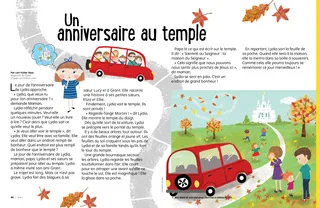 Il y a de beaux arbres tout autour. Ils ont des feuilles orange et jaune vif. Les feuilles au sol craquent sous les pas de Lydia et de sa famille tandis qu’ils font le tour du temple.