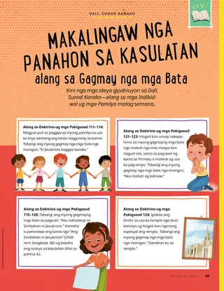 Alang sa Doktrina ug mga Pakigsaad 115–120: Tabangi ang inyong gagmayng mga bata sa pagsulti, “Ako nahisakop sa Simbahan ni Jesukristo.” Kantaha o paminawa ang kanta nga “Ang Simbahan ni Jesukristo” (Children‘s Songbook, 48) ug basaha ang istorya sa kasulatan diha sa pahina 42.