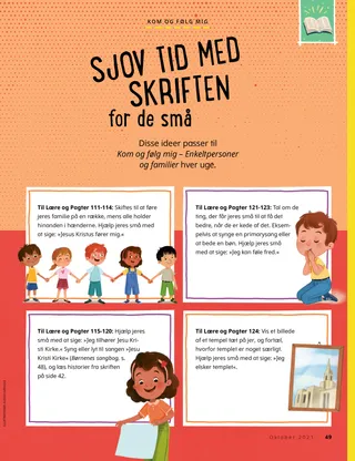 Til Lære og Pagter 115-120: Hjælp jeres små med at sige: »Jeg tilhører Jesu Kristi Kirke.« Syng eller lyt til sangen »Jesu Kristi Kirke« (Børnenes sangbog, s. 48), og læs historier fra skriften på side 42.