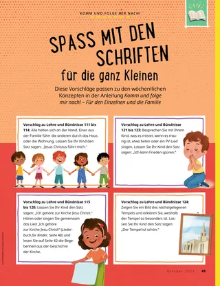 Vorschlag zu Lehre und Bündnisse 115 bis 120: Lassen Sie Ihr Kind den Satz sagen: „Ich gehöre zur Kirche Jesu Christi.“ Hören oder singen Sie gemeinsam das Lied „Ich gehöre zur Kirche Jesu Christi“ (Liederbuch für Kinder, Seite 48) und lesen Sie auf Seite 42 die Begebenheit aus der Geschichte der Kirche.