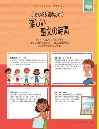 教義と聖約115-120章:幼い子供に「わたしはイエス・キリストの教会の会員です」と言ってもらいます。「イエス・キリストの教会」(『子供の歌集』48)を歌うか聞いて,42ページの聖文の物語を読んでください。