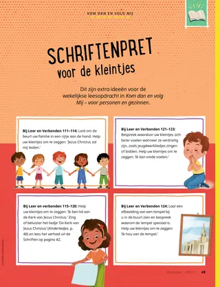 Bij Leer en verbonden 115–120: Help uw kleintjes om te zeggen: ‘Ik ben lid van de Kerk van Jezus Christus.’ Zing of beluister het liedje ‘De Kerk van Jezus Christus’ (Kinderliedjes, p. 48) en lees het verhaal uit de Schriften op pagina 42.