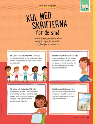 För Läran och förbunden 115–120: Hjälp de små att säga: ”Jag är medlem i Jesu Kristi kyrka.” Sjung eller lyssna på sången ”Jesu Kristi Kyrka” (Barnens sångbok, s. 48–49) och läs skriftberättelsen på sidan 42.
