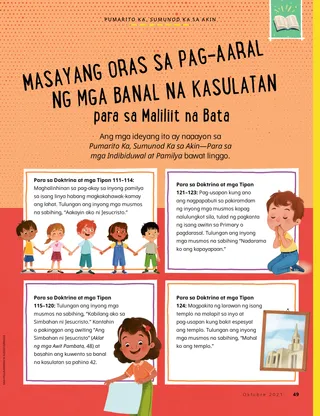 Para sa Doktrina at mga Tipan 115–120: Tulungan ang inyong mga musmos na sabihing, “Kabilang ako sa Simbahan ni Jesucristo.” Kantahin o pakinggan ang awiting “Ang Simbahan ni Jesucristo” (Aklat ng mga Awit Pambata, 48) at basahin ang kuwento sa banal na kasulatan sa pahina 42.