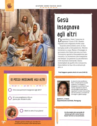 Quando aveva dodici anni, la Sua famiglia andò a Gerusalemme. Mentre tornavano a casa, Maria e Giuseppe si accorsero che Gesù non era con loro. Tornarono quindi a Gerusalemme per cercarLo. Lo trovarono che insegnava nel tempio. Le persone Lo ascoltavano e Gli facevano domande. Erano meravigliati da quello che conosceva. Gesù dedicò la Sua vita a istruire gli altri.