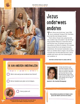 Toen Jezus 12 jaar was, ging hij met zijn ouders naar Jeruzalem. Op de terugweg merkten Maria en Jozef dat Jezus niet bij hen was. Ze gingen terug naar Jeruzalem om Hem te zoeken. Ze vonden Jezus terwijl Hij in de tempel mensen onderwees. De mensen luisterden naar Hem en stelden Hem vragen. Ze stonden versteld van wat Hij allemaal wist. Jezus wijdde zijn leven aan het onderwijzen van anderen.