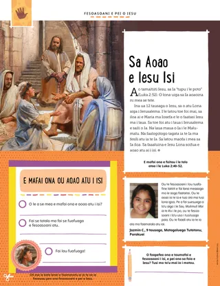 Ina ua 12 tausaga o Iesu, sa o atu Lona aiga i Ierusalema. I le latou toe foi mai, sa iloa ai e Maria ma Iosefa e le o faatasi Iesu ma i laua. Sa toe foi atu i laua i Ierusalema e saili o Ia. Na laua maua o Ia i le Malumalu. Na faalogologo tagata ia te Ia ma fesili atu ia te Ia. Sa latou maofa i mea sa Ia iloa. Sa faaaluina e Iesu Lona soifua e aoao atu ai i isi.