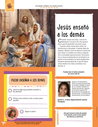Cuando Jesús tenía doce años, Su familia fue a Jerusalén. Cuando iban de regreso, María y José se dieron cuenta de que Jesús no estaba con ellos y regresaron a Jerusalén para buscarlo. Encontraron a Jesús enseñando en el templo y la gente lo escuchaba y le hacía preguntas. Estaban asombrados de lo que Él sabía. Jesús dedicó Su vida a enseñar a los demás.