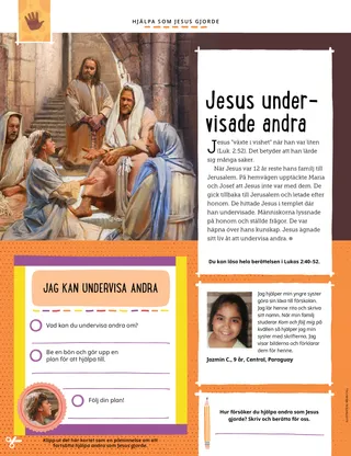 När Jesus var 12 år reste hans familj till Jerusalem. På hemvägen upptäckte Maria och Josef att Jesus inte var med dem. De gick tillbaka till Jerusalem och letade efter honom. De hittade Jesus i templet där han undervisade. Människorna lyssnade på honom och ställde frågor. De var häpna över hans kunskap. Jesus ägnade sitt liv åt att undervisa andra.