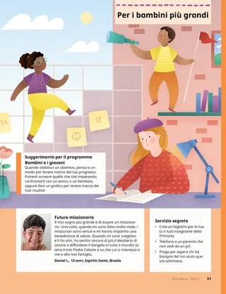 Ottobre 2021 Cari amici,Leggi un messaggio sui templi. Henry B. EyringAmare il tempioLeggi un messaggio del presidente Eyring sull’importanza dei templi. Lucy Stevenson EwellLa pace e le canzoni della PrimariaLa famiglia terrena di Max non era perfetta, ma lui non vedeva l’ora di avere un giorno una famiglia tutta sua. È ora di divertirsi con le ScrittureUsa queste attività per studiare Vieni e seguitami con la tua famiglia. Sheila KindredCome vedere MusaAngie pensa che il nuovo bambino arrivato nella sua classe si stia comportando male con sua sorella, ma forse non lo vede con chiarezza. L’anziano Renlund visita i CaraibiScopri di più sulla visita dell’anziano Renlund ai Caraibi! Trova gli oggetti!Riesci a trovare gli oggetti nascosti in questa immagine? Incontriamo Nathan dalla Repubblica del CongoIncontriamo Nathan dalla Repubblica del Congo e scopriamo in che modo aiuta gli altri come faceva Gesù. Gesù insegnava agli altriLeggi una storia di come Gesù imparava e insegnava, e fai un piano per aiutare come faceva Lui. Avventure nella Repubblica del Congo con Margo e PaoloScopri la Repubblica del Congo con Margo e Paolo e accetta la sfida Helping Hands. Jane McBridePreghiere per TessaTessa pensa che nessuno sia dalla sua parte. Poi viene a sapere che ci sono molte persone che stanno pregando per lei. Schede sulla storia della ChiesaColleziona le schede per imparare a conoscere i personaggi importanti della storia della Chiesa! Questo mese: Sagwitch Timbimboo e Anna Gaarden Widtsoe. Costruisci un tempioFai un puzzle del Tempio di Bangkok, in Thailandia. Haley YanceyLe due busteQuando riceve del denaro per il capodanno cinese, Chung decide di pagare la decima. Un’idea brillanteUn poster con il messaggio “Guarda al tempio! Molte benedizioni ti aspettano lì”. Janice Kapp PerryAmo il sacro tempioSuona questa versione semplificata di “Amo il sacro tempio”. Il mio primo viaggio al tempioSegui Elena mentre celebra i battesimi al tempio per la prima volta. Bonnie H. CordonUn luogo santoScopri perché il tempio è santo e come prepararti per entrarci. Schede dei templiRitaglia e colleziona queste schede dei templi! Mostra e raccontaUna raccolta di citazioni e lavori artistici di bambini da tutto il mondo. Matt e MandyMandy fa amicizia con una ragazza di un’altra religione. Per i bambini più grandi Per i bambini più grandiSuggerimenti e sfide per i bambini più grandi. Kristin PedersenMargaret CummingsMargaret e la sua famiglia hanno dovuto fare grandi sacrifici per andare al tempio, ma ne è valsa la pena! Conto alla rovescia per il tempioCon questa attività, fai un conto alla rovescia dei giorni che mancano per ricevere la raccomandazione per il tempio! Ricevere la raccomandazione per il tempioPreparati a ricevere la raccomandazione per il tempio leggendo le domande dell’intervista per il tempio. Charlotte LarcabalPronto per il tempioAjan impara come prepararsi per andare al tempio. Sudoku della decimaFai questa attività e scopri come viene usato il denaro delle decime e delle donazioni fatte alla Chiesa. Per i piccoli amici Per i piccoli amici Jennifer MaddyLa preghiera familiare di AnaAna dice la preghiera della sera con la sua famiglia. Gesù Cristo ha dato il nome alla Sua ChiesaLeggi una storia su come La Chiesa di Gesù Cristo dei Santi degli Ultimi Giorni ha avuto il suo nome. Io credo in Gesù CristoInsegna ai più piccoli usando una pagina da colorare incentrata sul Vangelo. Il messaggio di questo mese è: “Io credo in Gesù Cristo”. Lori Fuller SosaUn compleanno al tempioLydia va al tempio per il suo compleanno. Ciao, amici!Incontriamo alcuni piccoli amici da tutto il mondo. È ora di divertirsi con le Scritture per i più piccoliUsa queste idee per studiare Vieni e seguitami con i più piccoli. Cari genitoriLeggi un messaggio per i genitori su come aiutare i bambini a prepararsi per il tempio.