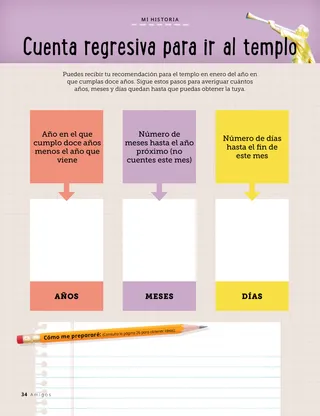 Octubre de 2021 Queridos amigosLean un mensaje sobre los templos. Henry B. EyringAmar el temploLean un mensaje del presidente Eyring sobre la importancia de los templos. Lucy Stevenson EwellLa paz y las canciones de la PrimariaLa familia terrenal de Max no era perfecta, pero él anhelaba tener su propia familia para siempre algún día. Momentos alegres con las EscriturasUtiliza estas actividades para estudiar Ven, sígueme con tu familia. Sheila KindredVer a MusaAngie cree que el nuevo niño de su clase está siendo malo con su hermana, pero tal vez no lo esté viendo a él con claridad. El élder Renlund visita el CaribeInfórmate sobre la visita del élder Renlund al Caribe. ¡Encuéntralos!¿Puedes encontrar los objetos escondidos en la ilustración? Conoce a Nathan, de la República del CongoConoce a Nathan, de la República del Congo, y descubre el modo en que él ayuda como Jesús. Jesús enseñó a los demásLee una historia sobre cómo Jesús aprendió y enseñó, y haz un plan para ayudar como lo hizo Él. Aventuras en la República del Congo con Margo y PaoloAprende acerca de la República del Congo con Margo y Paolo y participa en el desafío de Manos que Ayudan. Jane McBrideOraciones por TessaTessa piensa que nadie está de su lado, pero luego se entera de que hay muchas personas orando por ella. Tarjetas de la historia de la Iglesia¡Colecciona tarjetas para aprender acerca de personajes importantes de la historia de la Iglesia! Este mes: Sagwitch Timbimboo y Anna Gaarden Widtsoe. Construye un temploHaz un rompecabezas del Templo de Bangkok, Tailandia. Haley YanceyLos dos sobresCuando Chung recibe dinero por el Año Nuevo Chino, él escoge pagar el diezmo. Una idea brillanteUn póster con el mensaje “¡Espera con ilusión ir al templo! Allí te aguardan muchas bendiciones”. Janice Kapp PerryMe encanta ver el temploToca esta versión simplificada de “Me encanta ver el templo”. Mi primer viaje al temploAcompaña a Elena mientras hace bautismos en el templo por primera vez. Bonnie H. CordonUn lugar santoAprende por qué el templo es sagrado y cómo prepararte para entrar en él. Tarjetas de los templos¡Recorta y colecciona estas tarjetas de los templos! Muestra y cuéntaloUna colección de citas y de obras de arte de niños de alrededor del mundo. Matt y MandyMandy se hace amiga de una niña de otra religión. Para niños mayores Para niños mayoresSugerencias y desafíos para niños mayores. Kristin PedersenMargaret CummingsMargaret y su familia tuvieron que hacer grandes sacrificios para viajar al templo, ¡pero valió la pena! Cuenta regresiva para ir al templo¡Cuenta los días hasta que puedas obtener una recomendación para el templo con esta actividad! Obtener una recomendación para el temploPara prepararte para obtener tu recomendación para el templo, lee las preguntas de la entrevista. Charlotte LarcabalListo para el temploAjan aprende la manera de prepararse para ir al templo. Rompecabezas del diezmoHaz esta actividad y aprende cómo se utiliza el dinero del diezmo y de las donaciones de la Iglesia. Para los amigos más pequeños Para los amigos más pequeños Jennifer MaddyLa oración familiar de AnaAna hace una oración con su familia antes de acostarse. Jesucristo nombró Su IglesiaLee un relato sobre cómo La Iglesia de Jesucristo de los Santos de los Últimos Días obtuvo su nombre. Creo en JesucristoEnseñe a sus pequeños con una página para colorear centrada en el Evangelio. El mensaje de este mes es: “Creo en Jesucristo”. Lori Fuller SosaUn cumpleaños en el temploLydia visita el templo en su cumpleaños. ¡Hola, amigos!Conoce a algunos niños de la Primaria de todo el mundo. Momentos alegres con las Escrituras para los más pequeñosUtilice estas ideas para estudiar Ven, sígueme con sus pequeños. Estimados padresLean un mensaje para los padres sobre cómo ayudar a los hijos a prepararse para el templo.
