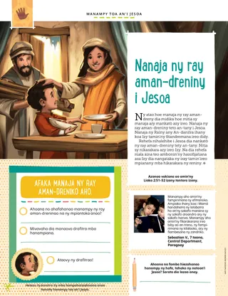 Ny atao hoe manaja ny ray aman-dreny dia midika hoe mitia sy manaja ary mankatò azy ireo. Nanaja ny ray aman-dreniny teto an-tany i Jesoa. Nanaja ny Rainy any An-danitra ihany koa Izy tamin’ny fitandremana ireo didy.