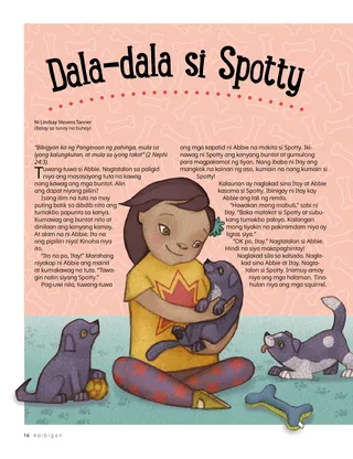 Naisip ni Abbie kung paano niya kinarga si Spotty. Ganyan tayong tinutulungan ni Jesus, naisip ni Abbie. Maaaring hindi siya talagang kinakarga ni Jesus, pero tinulungan Niya siyang maging mas malakas kapag kailangan niya Siya. Tulad noong isang gabi, nang siya ay natakot sa dilim. Nanalangin siya at nadama niyang ligtas siya. O noong nag-aalala siya na baka malimutan niya ang kanyang homework. Nagdasal siya noon at gumanda ang pakiramdam niya—at naalala niya ito!