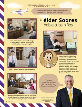 Para la transmisión mundial De amigo a amigo, Abby y Thomas hablaron con el élder Ulisses Soares en inglés.