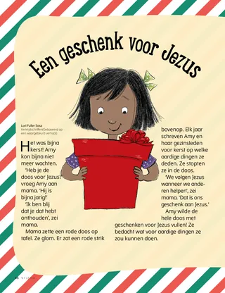Mama zette een rode doos op tafel. Ze glom. Er zat een rode strik bovenop. Elk jaar schreven Amy en haar gezinsleden voor kerst op welke aardige dingen ze deden. Ze stopten ze in de doos.