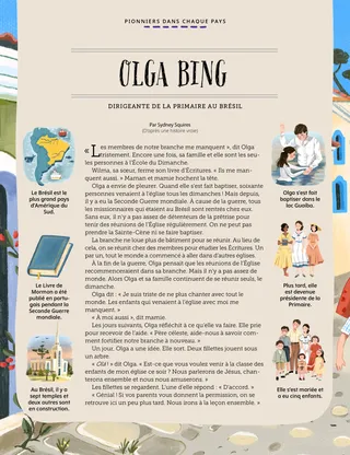 Olga a envie de pleurer. Quand elle s’est fait baptiser, soixante personnes venaient à l’église tous les dimanches ! Mais depuis, il y a eu la Seconde Guerre mondiale. À cause de la guerre, tous les missionnaires qui étaient au Brésil sont rentrés chez eux. Sans eux, il n’y a pas assez de détenteurs de la prêtrise pour tenir des réunions de l’Église régulièrement. On ne peut pas prendre la Sainte-Cène ni se faire baptiser.