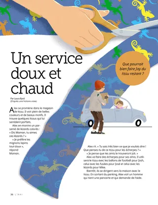 Cette semaine, pendant la soirée familiale, Alex explique à toute sa famille comment faire des écharpes. Sa maman les mesure. Son papa coupe le tissu. Alex et sa sœur font les franges. Il aime utiliser le tissu avec les lézards pour faire des écharpes. Pendant qu’il travaille, les lézards semblent sourire.