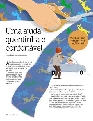 Quando chegaram em casa, a mãe de Alex mostrou a ele como deixar o tecido reto e medir o quanto ele iria precisar para fazer um cachecol. Ele cortou o tecido cuidadosamente com a tesoura. Depois, fez vários cortes nas extremidades para fazer a franja. Em pouco tempo, Alex fez seis cachecóis alegremente coloridos. Havia uma pilha enorme de tecido sobrando.