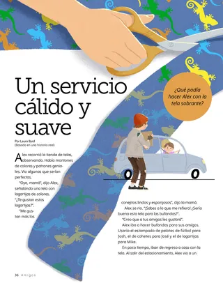 Cuando llegaron a casa, su mamá le mostró cómo colocar recta la tela y medir la cantidad que necesitaba para hacer una bufanda. Él cortó cuidadosamente la tela con las tijeras y luego hizo cortes a lo largo de los extremos para formar flecos. Al poco tiempo, Alex tenía seis bufandas de colores vivos. También había una gran cantidad de tela sobrante.