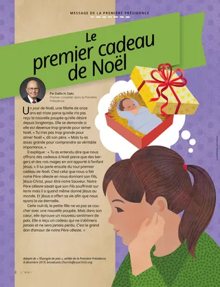 Il explique : « Tu as entendu dire que nous offrons des cadeaux à Noël parce que des bergers et des rois mages en ont apporté à l’enfant Jésus. » Il lui parle ensuite du tout premier cadeau de Noël. C’est celui que nous a fait notre Père céleste en nous donnant son Fils, Jésus-Christ, pour être notre Sauveur. Notre Père céleste savait que son Fils souffrirait sur terre mais il a quand même donné Jésus au monde. Et Jésus a offert sa vie afin que nous ayons la vie éternelle.