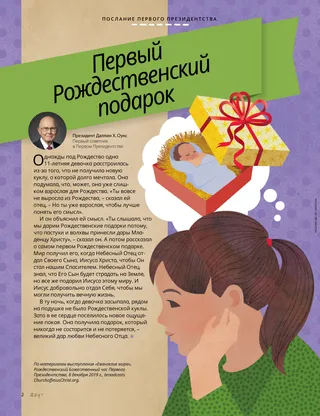 И он объяснил ей смысл. «Ты слышала, что мы дарим Рождественские подарки потому, что пастухи и волхвы принесли дары Младенцу Христу», – сказал он. А потом рассказал о самом первом Рождественском подарке. Мир получил его, когда Небесный Отец отдал Своего Сына, Иисуса Христа, чтобы Он стал нашим Спасителем. Небесный Отец знал, что Его Сын будет страдать на Земле, но все же подарил Иисуса этому миру. И Иисус добровольно отдал Себя, чтобы мы могли получить вечную жизнь.