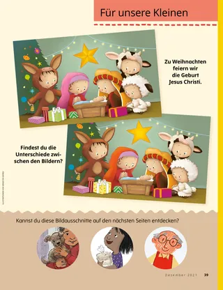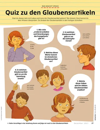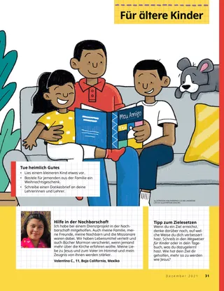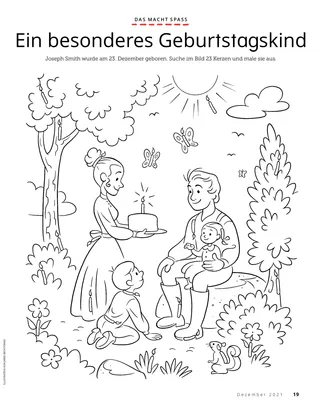 Dezember 2021 Liebe FreundeEine Botschaft über Weihnachten. Dallin H. OaksDas erste WeihnachtsgeschenkEine Botschaft von Präsident Dallin H. Oaks über die wahren Gaben zur Weihnachtszeit. Richard M. RomneyDie WeihnachtstorteKaiya beschließt, auf die Weihnachtstorte zu verzichten, damit sein Freund zu Weihnachten eine haben kann. Spaß mit den SchriftenAnregungen für das gemeinsame Studium der Anleitung Komm und folge mir nach! mit der Familie. Jessica LarsenWeihnachten in MaliIn Mali feiern nicht viele Menschen Weihnachten, aber Judith freut sich, dass sie in ihrem Zweig die Geburt Jesu Christi feiern kann. Elder Soares spricht zu den KindernEin kurzer Bericht über Elder Ulisses Soares und die Veranstaltung „Von Freund zu Freund“ für Kinder. SuchbildFindest du die versteckten Gegenstände? Willard aus BurundiWillard aus Burundi hilft so, wie Jesus es getan hat. Jesus war für andere daEine Begebenheit, wie Jesus für andere da war, und eine Aufforderung, selbst so zu handeln. Abenteuer in Burundi mit Margo und PaoloErfahre mit Margo und Paolo mehr über Burundi und nimm den Auftrag für diesen Monat an. Lindsay Stevens TannerMit Pünktchen auf dem ArmAbbie erkennt: So wie sie sich um einen Welpen kümmert, kümmert sich Jesus auch um sie. Karten zur Geschichte der KircheSammelkarten zu Persönlichkeiten aus der Geschichte der Kirche. Diesen Monat: Tsune Ishida Nachie und Truman O. Angell. Ein besonderes GeburtstagskindMit dieser Aktivität kannst du Joseph Smiths Geburtstag feiern. Maryssa DennisFröhliche WeihnachtenAlan besucht zu Weihnachten seine Großeltern und bekommt eine besondere Überraschung. Ein guter GedankeEin Poster zur Weihnachtsgeschichte zum Ausschneiden und Aufhängen. Jan PinboroughMarias WiegenliedLerne, das Weihnachtslied „Marias Wiegenlied“ zu spielen. Marissa WiddisonDie Geburt JesuMit diesen Figuren kannst du die Weihnachtsgeschichte nachspielen. Thierry K. MutomboDie Glaubensartikel bedeuten mir vielEine Botschaft von Elder Thierry K. Mutombo über die Bedeutung der Glaubensartikel. Quiz zu den GlaubensartikelnWie gut kennst du die Glaubensartikel? Mit diesem Quiz findest du es heraus. Erzähl uns wasAussagen und Kunstwerke von Kindern aus aller Welt. Lukas und LeneLukas und Lene lernen den dreizehnten Glaubensartikel. Für ältere Kinder Für ältere KinderTipps und Aufträge für ältere Kinder. Sydney SquiresOlga BingOlga ist traurig, weil keiner mehr zur Kirche kommt, also lädt sie Leute ein. Chelsea Flake MortensenWeihnachtsbasteleien aus aller WeltBastele Weihnachtsschmuck aus aller Welt. Laura ByrdWarme, kuschelige HilfeAlex fertigt für Leute in Not Schals an. Mein JahresrückblickFreu dich über das, was du dieses Jahr gelernt und erlebt hast. Für unsere Kleinen Für unsere Kleinen Jane McBrideBesondere WeihnachtskartenHyrum schickt eine besondere Weihnachtskarte an jemanden, der weit weg wohnt. Die Kirche in aller WeltSo ist die Kirche in der ganzen Welt gewachsen. Jesus liebt uns alleUnterweisen Sie Ihr kleines Kind mit einem Ausmalbild zum Evangelium. Die Botschaft für diesen Monat: „Jesus liebt uns alle.“ Lori Fuller SosaEin Geschenk für JesusAmy und ihre Familie beschenken zu Weihnachten Jesus, indem sie gute Tagen vollbringen. Hallo, Freunde!Beiträge von Kindern aus aller Welt. Spaß mit den Schriften für die ganz KleinenAnregungen für das Studium der Anleitung Komm und folge mir nach! mit kleinen Kindern. Liebe Eltern!Ein paar Worte an die Eltern, wie man das Weihnachtsfest in der Familie auf Christus ausrichtet.