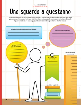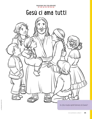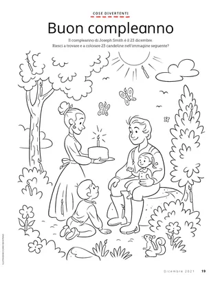 Dicembre 2021 Cari amiciLeggete un messaggio sul Natale. Dallin H. OaksIl primo dono di NataleLeggete un messaggio del presidente Dallin H. Oaks sul vero dono del Natale. Richard M. RomneyLa torta di NataleKaiya rinuncia alla sua torta di Natale così che il suo amico possa ricevere qualcosa di speciale durante le feste. È ora di divertirsi con le ScrittureUsa queste idee per studiare Vieni e seguitami con la tua famiglia. Jessica LarsenNatale in MaliNon sono molte le persone che in Mali celebrano il Natale, ma Judith è felice di poter festeggiare la nascita di Gesù Cristo con il proprio ramo. L’anziano Soares parla ai bambiniScopri di più sull’anziano Ulisses Soares e sull’evento Da amico ad amico dedicato ai bambini. Trova gli oggetti!Riesci a trovare gli oggetti nascosti in questa immagine? Incontriamo Willard dal BurundiIncontriamo Willard dal Burundi e scopriamo in che modo aiuta come faceva Gesù. Gesù tendeva la mano al prossimoLeggi la storia di come Gesù tendeva la mano al prossimo e studia un piano per poter aiutare come faceva Lui. Avventure in Burundi con Margo e PaoloScopri il Burundi con Margo e Paolo e accetta la sfida Helping Hands. Lindsay Stevens TannerL’amore per MacchiaAbbie si rende conto che il modo in cui lei si occupa del suo cucciolo è simile al modo in cui Gesù si occupa di lei. Schede sulla storia della ChiesaColleziona le schede per conoscere i personaggi importanti della storia della Chiesa! Questo mese: Tsune Ishida Nachie e Truman O. Angell. Buon compleannoSvolgi questa attività per festeggiare il compleanno di Joseph Smith! Maryssa DennisLa sorpresa nella piñataAlan fa visita ai nonni per Natale e riceve una sorpresa speciale Un’idea brillantePuoi ritagliare questo poster sulla Natività e appenderlo a una parete. Jan PinboroughNinna nanna di MariaImpara a suonare una nuova canzone di Natale, la “Ninna nanna di Maria”. Marissa WiddisonQuando è nato GesùRacconta la storia della nascita di Gesù Cristo con i personaggi da ritagliare. Thierry K. MutomboPerché amo gli Articoli di FedeLeggi un messaggio dell’anziano Thierry K. Mutombo sull’importanza degli Articoli di Fede. Quiz sugli Articoli di FedeQuanto conosci gli Articoli di Fede? Completa il quiz per scoprirlo. Mostra e raccontaUna raccolta di citazioni e lavori artistici di bambini da tutto il mondo. Matt e MandyMatt e Mandy studiano il tredicesimo Articolo di Fede. Per i bambini più grandi Per i bambini più grandiSuggerimenti e sfide per i bambini più grandi. Sydney SquiresOlga BingOlga è triste che le persone abbiano smesso di andare in chiesa, perciò invita gli altri a unirsi a lei. Chelsea Flake MortensenLavoretti natalizi nel mondoRealizza questi lavoretti natalizi da tutto il mondo Laura ByrdUn servizio caldo e avvolgenteAlex realizza sciarpe in più per chi potrebbe averne bisogno. Uno sguardo a quest’annoCelebra le cose che hai imparato e i ricordi che hai creato quest’anno! Per i piccoli amici Per i piccoli amici Jane McBrideBiglietti di Natale specialiHyrum realizza un biglietto di Natale per le persone che vivono lontano. La Chiesa nel mondoLeggi una storia su come la Chiesa sia cresciuta in tutto il mondo. Gesù ci ama tuttiInsegna ai più piccoli usando una pagina da colorare incentrata sul Vangelo. Il messaggio di questo mese è: “Gesù ci ama tutti”. Lori Fuller SosaUn dono per GesùAmy e la sua famiglia fanno un dono di Natale a Gesù compiendo buone azioni. Ciao, amici!Incontriamo alcuni piccoli amici da tutto il mondo. È ora di divertirsi con le Scritture per i più piccoliUsa queste idee per studiare Vieni e seguitami con i più piccoli. Cari genitori,Leggi un messaggio per i genitori su come avere un Natale incentrato su Cristo con la propria famiglia.