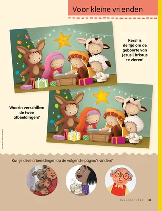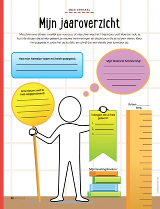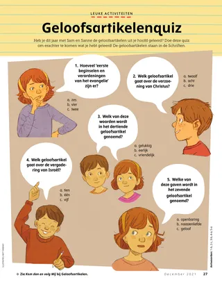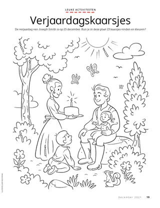 December 2021 Dag vriendjesLees een boodschap over Kerstmis. Dallin H. OaksHet eerste kerstgeschenkLees een boodschap van president Dallin H. Oaks over het ware kerstgeschenk. Richard M. RomneyDe kersttaartKaiya geeft zijn kersttaart weg zodat zijn vriend met kerst een lekkernij heeft. SchriftenpretDit zijn extra ideeën voor de wekelijkse leesopdracht in Kom dan en volg Mij – voor personen en gezinnen. Jessica LarsenKerstmis in MaliIn Mali vieren niet veel mensen Kerstmis, maar Judith is blij dat ze de geboorte van Jezus Christus met haar gemeente kan vieren. Ouderling Soares spreekt met kinderenLees over ouderling Ulisses Soares en het Vriend tot vriend-evenement voor kinderen. Zoeken maar!Kun je de voorwerpen vinden die in deze plaat verborgen zitten? Dit is Willard uit BurundiMaak kennis met Willard uit Burundi en kom te weten hoe hij anderen helpt zoals Jezus dat deed. Jezus hielp anderenLees een verhaal waarin Jezus anderen helpt, en maak een plan om te helpen zoals Hij dat deed. Avonturen in Burundi met Margo en PaoloLeer over Burundi met Margo en Paolo en neem de helpende-handenuitdaging aan. Lindsay Stevens TannerVlekkie dragenAbbie beseft dat de manier waarop ze voor haar puppy zorgt, lijkt op de manier waarop Jezus voor haar zorgt. KerkgeschiedeniskaartjesVerzamel kaartjes over belangrijke mensen uit de kerkgeschiedenis! Deze maand: Tsune Ishida Nachie en Truman O. Angell. VerjaardagskaarsjesDoe deze activiteit om de verjaardag van Joseph Smith te vieren! Maryssa DennisDe piñataverrassingAlan bezoekt met kerst zijn grootouders en krijgt een speciale verrassing. Schitterend ideeJe kunt deze kerstposter uitknippen en aan je muur hangen. Jan PinboroughMaria’s wiegeliedLeer een nieuw kerstliedje spelen: ‘Maria’s wiegelied’ Marissa WiddisonToen Jezus was geborenVertel het verhaal van de geboorte van Jezus Christus met uitknipfiguren. Thierry K. MutomboWaarom ik van de geloofsartikelen houLees een boodschap waarin ouderling Thierry K. Mutombo vertelt waarom de geloofsartikelen belangrijk zijn. GeloofsartikelenquizHoe goed ken jij de geloofsartikelen? Doe deze quiz om daarachter te komen! Plaatjes en praatjesEen verzameling kunstwerken en verhaaltjes van kinderen uit de hele wereld. Sam en SanneSam en Sanne bestuderen het dertiende geloofsartikel. Voor grote kinderen Voor grote kinderenTips en uitdagingen voor grote kinderen. Sydney SquiresOlga BingOlga is verdrietig dat mensen niet meer naar de kerk komen, dus ze nodigt anderen uit om met haar mee te gaan. Chelsea Flake MortensenKerstknutselwerkjes uit de hele wereldMaak deze kerstknutselwerkjes uit de hele wereld. Laura ByrdWarm en wollig dienstbetoonAlex maakt extra sjaals voor mensen die ze misschien nodig hebben. Mijn jaaroverzichtVier wat je dit jaar hebt geleerd en vier je herinneringen aan dit jaar! Voor kleine vrienden Voor kleine vrienden Jane McBrideBijzondere kerstkaartjesHyrum maakt een kerstkaartje voor iemand die ver weg woont. De kerk over de hele wereldLees een verhaal over de wereldwijde groei van de kerk. Jezus houdt van iedereenOnderwijs uw kleintjes met een evangeliegerichte kleurplaat. De boodschap van deze maand is ‘Jezus houdt van iedereen’. Lori Fuller SosaEen geschenk voor JezusAmy en haar familie geven een kerstgeschenk aan Jezus door aardige dingen te doen. Hallo, vrienden!Maak kennis met vriendjes over de hele wereld. Schriftenpret voor de kleintjesTips om Kom dan en volg Mij met kleine kinderen te bestuderen. Beste oudersLees in een boodschap voor ouders hoe u deze kerst met uw gezin Christus centraal kunt stellen.