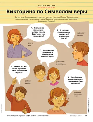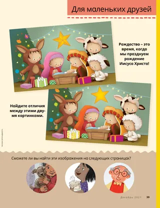 Декабрь 2021 Дорогие друзья!Прочитайте послание о Рождестве. Президент Даллин Х. ОуксПервый Рождественский подарокПрочитайте послание президента Даллина Х. Оукса о настоящем даре Рождества. Ричард М. РомниРождественский пирогКайя отдает свой Рождественский пирог другу, чтобы у него было угощение на Рождество. Весело проводим время со Священными ПисаниямиЭти идеи помогут вам изучать материалы Приходи, следуй за Мною с семьей. Джессика МартинесРождество в МалиВ Мали не очень много людей празднуют Рождество, но Джудит рада возможности отметить рождение Иисуса Христа в своем небольшом приходе. Старейшина Соарес обращается к детямУзнайте о старейшине Соаресе и детском мероприятии «От друга к другу». Найдите!Сможете ли вы найти на картинке спрятанные предметы? Познакомьтесь с Уиллардом из БурундиПознакомьтесь с Уиллардом из Бурунди и узнайте, как он помогает по примеру Иисуса. Иисус протягивал окружающим руку помощиПрочитайте историю о том, как Иисус протягивал руку помощи людям, и составьте план помогать по Его примеру. Приключения в Бурунди с Марго и ПаолоУзнайте о Бурунди с Марго и Паоло и примите вызов команды «Руки помощи». Линдси Стивенс ТаннерЗабота о СпоттиЭбби осознаёт, что ее забота о щенке напоминает заботу Иисуса о нас. Карточки по истории ЦерквиКоллекционируйте карточки, узнавая о значимых людях в истории Церкви! В этом месяце: Дзуне Ишида Начи и Труман О. Энджел. День рожденияВыполните это задание в честь дня рождения Джозефа Смита! Марисса ДеннисСюрприз из пиньятыАлан навещает своих дедушку и бабушку и получает особый сюрприз. Важная мысльМожно вырезать этот плакат с изображением сцены Рождества и повесить его на стену. Слова: Джен ПинбороКолыбельная МарииНаучитесь играть еще одну Рождественскую песню, «Колыбельная Марии». Марисса УиддисонКогда Иисус родилсяРасскажите историю рождения Иисуса при помощи бумажных фигурок. Старейшина Тьерри К. МутомбоПочему я люблю Символы верыПрочитайте послание старейшины Тьерри К. Мутомбо о том, в чем состоит важное значение Символов веры. Викторина по Символам верыНасколько хорошо вы знаете Символы веры? Узнайте при помощи этой викторины! Покажи и расскажиКоллекция детских высказываний, рисунков и поделок со всего мира. Мэтт и МэндиМэтт и Мэнди изучают тринадцатый Символ веры. Для детей старшего возраста Для детей старшего возрастаПолезные советы и задания для детей старшего возраста. Сидни СквайрсОльга БингОльге грустно, что люди прекращают приходить в церковь, поэтому она приглашает всех посещать Церковь вместе с ней. Челси Флейк МортенсенРождественские поделки из разных стран мираСмастерите Рождественские поделки из разных стран мира. Лора БердТеплое служение с бахромойАлекс мастерит запасные шарфы для людей, которые они могут пригодиться. Как прошел мой годПорадуйтесь тому, что вы узнали, и воспоминаниям, которые у вас появились за этот год! Для маленьких друзей Для маленьких друзей Джейн Макбрайд Особенные Рождественские открыткиХайрам мастерит особенную Рождественскую открытку для людей, которые находятся вдали от него. Церковь по всему мируПрочитайте историю о том, как Церковь растет по всему миру Иисус любит всех насОбучите своих малышей при помощи раскраски, сосредоточенной на Евангелии. Послание этого месяца: «Иисус любит всех нас». Лори Фулле