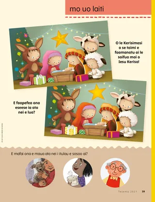 Tesema 2021 Uo PelēFaitau se savali e uiga i le Kerisimasi. Dallin H. Oaks O Le Ulua’i Meaalofa o le KerisimasiFaitau se savali mai ia Peresitene Dallin H. Oaks e uiga i le meaalofa moni o le Kerisimasi. Richard M. RomneyO Le Keke o le KerisimasiUa foai ese e Kaiya lana keke Kerisimasi ina ia mafai ai e lana uo ona maua se meaai mama mo le Kerisimasi. Taimi Fiafia i Tusitusiga PaiaFaaaoga nei gaoioiga ma manatu e suesue ai le Sau, Mulimuli Mai ia te A’u ma lou aiga. Jessica Larsen O Le Kerisimasi i MaliE le toatele ni tagata e faamanatuina le Kerisimasi i Mali, ae ua fiafia Judith e mafai ona ia faamanatuina le soifua mai o Iesu Keriso i lana paranesi. Ua Saunoa Atu Elder Soares i TamaitiAoao e uiga ia Elder Ullises Soares ma le Uo i le Uo o se polokalama faapitoa mo tamaiti. Su’e Mai!E mafai ona e maua mea o loo natia i le ata? Feiloai ia Willard mai BurundiFeiloai ia Willard mai Burundi ma aoao i le ala na te fesoasoani ai e pei ona sa faia e Iesu. Sa Aapa Atu Iesu i IsiFaitau se tala e uiga i le ala na aapa atu ai Iesu i isi ma faia se fuafuaga e fesoasoani ai, e pei ona sa Ia faia. Malaga Asiasi i Burundi faatasi ma Margo ma PaoloAoao e uiga i Burundi faatasi ma Margo ma Paolo ma fai le lu’i o Lima Fesoasoani. Lindsay Stevens TannerSi’iina o SpottyUa iloa e Abbie o le ala na te tausia ai lana tamai maile e pei lava o le ala e tausia ai o ia e Iesu. Kata o le Talafaasolopito o le EkalesiaAo mai ni kata e a’oa’o ai e uiga i tagata taua o le talafaasolopito o le Ekalesia! Masina lenei: Tsune Ishida Nachie ma Truman O. Angell. Taimi o le Aso FanauFai le gaoioiga lenei e faamanatu ai le Aso Fanau o Iosefa Samita! Maryssa DennisO le Piñata Faate’iaUa asiasi atu Alan i ona matua matutua mo le Kerisimasi ma maua ai se mea faapitoa na faateia ai. Manatu LeleiE mafai ona e oti esea lenei pepa lautele o i ai se savali o le Soifua Mai o Iesu ma tautau i luga o lou puipui. Jan PinboroughO le Pese Moe a MariaAoao e ta se pese fou o le Kerisimasi, “O le Pese Moe a Maria.” Marissa WiddisonIna Ua Fanau Mai IesuFaamatala le tala i le soifua mai o Iesu Keriso ma ni tagata faatusa e ’oti-ese. Thierry K. MutomboAisea Ou te Fiafia ai i Mataupu Faavae o le FaatuatuaFaitau se savali mai ia Elder Thierry K. Mutombo e uiga i le mafuaaga e taua ai Mataupu Faavae o le Faatuatua. Suega Puupuu o Mataupu Faavae o le FaatuatuaO le a le lelei o lou iloa o Mataupu Faavae o le Faatuatua? Ia faia lenei suega puupuu e iloa ai! Faaali ma Ta’u AtuO se tuufaatasiga o upusii ma ata a tamaiti mai le salafa o le lalolagi. Matt ma MandyUa suesue e Matt ma Mandy le mataupu faavae o le faatuatua lona sefulutolu. Mo Tamaiti Matutua Mo Tamaiti MatutuaO motugaafa ma luitau mo tamaiti e matutua atu. Sydney SquiresOlga BingUa faanoanoa Olga ona ua le toe o mai tagata i le lotu, o lea ua ia valaaulia ai isi e faatasi ma ia. Chelsea Flake MortensenO Meataulima o le Kerisimasi i le salafa o le LalolagiFai nei meataulima o le Kerisimasi mai le salafa o le lalolagi. Laura ByrdAuaunaga Mamoe, Mafanafana Ua faia e Alex ni sikafu faaopoopo mo tagata atonu e manaomia i latou. O La’u Tausaga o loo IloiloinaFaamanatu mea na e aoaoina ma manatuaga na e faia i lenei tausaga! Mo Uo Laiti Mo Uo Laiti Jane McBrideKata Faapitoa o le KerisimasiUa faia e Ailama se kata Kerisimasi mo se tasi e mamao ese. O Le Ekalesia i le salafa o le LalolagiFaitau se tala e uiga i le ala ua tuputupu ae ai le Ekalesia i le lalolagi atoa. E Alofa Iesu Ia I Tatou UmaIa aoao atu a outou fanau laiti i se itulau valivali e faaogatotonulemu i le talalelei. O le savali o lenei masina o le, “E alofa Iesu ia i tatou uma.” Lori Fuller SosaO Se Meaalofa mo IesuUa tuuina atu e Amy ma lona aiga se meaalofa o le Kerisimasi ia Iesu e ala i le faia o mea lelei. Talofa, Uo!Feiloai atu i nisi o uo laiti mai le salafa o le lalolagi. Taimi Fiafia i Tusitusiga Paia mo Fanau LaitiFaaaoga nei manatu e suesue ai le Sau, Mulimuli mai ia te A’u ma a outou fanau laiti. Matua PelēFaitau se savali mo matua e uiga i le auala e maua ai se Kerisimasi e faatotonugalemu ia Keriso ma lou aiga.