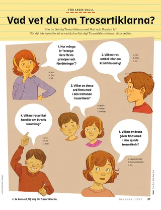 December 2021 Kära vännerLäs ett budskap om julen. Dallin H. OaksDen första julklappenLäs ett budskap från president Dallin H. Oaks om julens sanna gåva. Richard M. RomneyJultårtanKaiya avstår från sin jultårta så att hans vän kan få något gott till jul. Kul med skrifternaAnvänd de här förslagen för att studera Kom och följ mig med din familj. Jessica LarsenJul i MaliDet är inte många som firar jul i Mali, men Judith är glad att hon kan fira Jesu Kristi födelse med sin gren. Äldste Soares pratar med barnLär dig mer om äldste Ulisses Soares och evenemanget Vänner emellan för barn. Hitta dem!Kan du hitta de gömda sakerna i bilden? Möt Willard från BurundiMöt Willard från Burundi och läs om hur han hjälper som Jesus gjorde. Jesus nådde ut till andraLäs en berättelse om hur Jesus nådde ut till andra och gör sedan upp en plan på att hjälpa som han gjorde. Äventyr i Burundi med Margo och PaoloLär dig om Burundi med Margo och Paolo och gör månadens utmaning för Hjälpande händer. Lindsay Stevens TannerBära PrickenAbbie inser att hennes sätt att ta hand om sin valp är som Jesus sätt att ta hand om henne. Kort om kyrkans historiaSamla på kort för att lära dig om viktiga personer i kyrkans historia! Den här månaden: Tsune Ishida Nachie och Truman O. Angell. FödelsedagsdagsGör den här aktiviteten för att fira Joseph Smiths födelsedag! Maryssa DennisPiñata-överraskningenAlan besöker sina morföräldrar på julafton och får en speciell överraskning. Bra idéDu kan klippa ut den här affischen och hänga upp den på väggen. Jan PinboroughMarias vaggsångLär dig spela en ny julsång, ”Marias vaggsång”. Marissa WiddisonNär Jesus föddesBerätta om när Jesus Kristus föddes med hjälp av utklippta figurer. Thierry K. MutomboVarför jag älskar TrosartiklarnaLäs ett budskap från äldste Thierry K. Mutombo om varför Trosartiklarna är viktiga. Vad vet du om Trosartiklarna?Hur väl känner du till Trosartiklarna? Gör det här testet för att ta reda på det! Visa och berättaEn samling av citat och konstverk från barn runt om i världen. Matt och MandyMatt och Mandy studerar den trettonde trosartikeln. För äldre barn För äldre barnTips och utmaningar för äldre barn. Sydney SquiresOlga BingOlga är ledsen över att folk har slutat komma till kyrkan, så hon bjuder in andra att komma med henne till kyrkan. Chelsea Flake MortensenJulhantverk runt om i världenProva på de här julhantverken från hela världen. Laura ByrdVarmt, fluffigt tjänandeAlex gör extra halsdukar till personer som kan behöva dem. Mitt år i backspegelnGläds åt de saker du har lärt dig och de minnen du har skapat i år! För små vänner För små vänner Jane McBrideSpeciella julkortHyrum gör ett julkort till någon som är långt borta. Kyrkan runt om i världenLäs en berättelse om hur kyrkan har vuxit runt om i världen. Jesus älskar oss allaUndervisa era små med en evangeliecentrerad färgläggningssida. Den här månadens budskap är: ”Jesus älskar oss alla.” Lori Fuller SosaEn julklapp till JesusAmy och hennes familj ger Jesus en julklapp genom att göra snälla saker. Hej vänner!Möt några unga vänner från hela världen. Kul med skrifterna för de småAnvänd de här förslagen när ni studerar Kom och följ mig med era små. Kära föräldrar!Läs ett budskap till föräldrar om hur ni kan ha en jul som är inriktad på Kristus i familjen.
