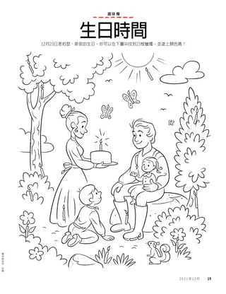 2021年12月 親愛的朋友閱讀一則有關聖誕節的信息。 達林·鄔克司會長第一份聖誕禮物閱讀達林·鄔克司會長有關聖誕節真正禮物的信息。 理查·羅慕義聖誕蛋糕凱也為了讓朋友得到聖誕點心,放棄了自己的聖誕蛋糕。 經文時間趣味活動運用這些建議和家人一起研讀來跟從我。 潔西卡·拉森在馬利過聖誕節在馬利慶祝聖誕節的人不多,但茱迪絲很高興能和分會的人一起慶祝耶穌基督的誕生。 蘇瑞長老對兒童說話認識尤理西斯·蘇瑞長老,和給兒童的朋友對朋友活動。 找找看!你能在圖中找出隱藏的物件嗎? 認識來自蒲隆地的威拉認識來自蒲隆地的威拉,了解他如何像耶穌那樣幫助人。 耶穌主動關心他人閱讀耶穌如何關心他人的故事,然後擬定一個計畫去幫忙,就像祂一樣。 跟瑪歌和保羅一起探索蒲隆地跟瑪歌和保羅一起學習有關蒲隆地的事,並接受援助之手的挑戰。 琳賽·譚納看顧小斑艾碧體會到她照顧小狗的方式,和耶穌照顧她的方式一樣。 教會歷史卡收集卡片來認識教會歷史中的一些重要人物!本月:奈知江(石田)常和楚門·安吉爾。 生日時間進行這項活動以慶祝約瑟·斯密的生日! 瑪麗莎·丹尼斯皮納塔的驚喜亞倫到祖父母家過聖誕節,得到一個特別的驚喜。 福音靈光可以把這幅耶穌降生的海報剪下來掛在牆上。 詞:珍·賓柏若芙馬利亞的催眠曲學習彈奏一首新的聖誕歌曲:「馬利亞的催眠曲」。 瑪瑞莎·韋迪森耶穌誕生時用紙偶講述耶穌基督誕生的故事。 瑟瑞·穆同博長老我為什麼喜愛信條閱讀瑟瑞·穆同博長老的信息,明白信條的重要。 信條測驗你對信條知道多少?做個測驗來看看。 看看我,聽聽我世界各地兒童的話語和美術作品。 馬太和曼蒂馬太和曼蒂學習信條第十三條。 大孩子園地 大孩子園地給大孩子的建議和挑戰。 席妮·斯奎爾奧嘉·賓恩奧嘉很難過,因為很多人不來教會了,她決定邀請人和她一起來教會。 雀兒喜·摩森世界各地的聖誕美勞製作這些來自世界各地的聖誕美勞 蘿拉·柏德溫馨,柔軟的服務艾力士多做了幾條圍巾,送給需要的人。 我的年度回顧表揚你今年學到的事情,以及留下的回憶! 幼兒園地 幼兒園地 珍·麥克布萊特別的聖誕卡海侖做了一張聖誕卡,送給遠方的一個人。 教會在世界各地閱讀教會在世界各地成長的故事 耶穌愛我們每個人用福音為主題的著色頁,來教導你的小小孩。這個月的主題是「耶穌愛我們每個人」。 蘿莉·索薩給耶穌的禮物艾美和家人送給耶穌的聖誕禮物就是做好事。 朋友,你好!認識世界各地的小朋友們。 小小孩經文時間趣味活動運用這些建議,和小小孩一起研讀來跟從我。 親愛的父母閱讀給父母的信息,關於如何和家人過一個以基督為中心的聖誕節。