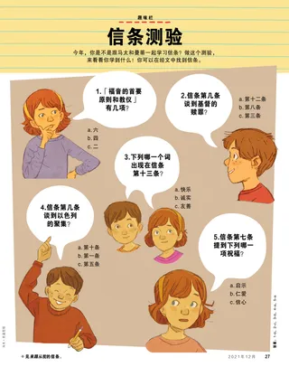 2021年12月 亲爱的朋友阅读一则有关圣诞节的信息。 达林·邬克司会长第一份圣诞礼物阅读达林·邬克司会长有关圣诞节真正礼物的信息。 理查·罗慕义圣诞蛋糕凯也为了让朋友得到圣诞点心,放弃了自己的圣诞蛋糕。 经文时间趣味活动运用这些建议和家人一起研读来跟从我。 洁西卡·拉森在马利过圣诞节在马利庆祝圣诞节的人不多,但茱迪丝很高兴能和分会的人一起庆祝耶稣基督的诞生。 苏瑞长老对儿童说话认识尤理西斯·苏瑞长老,和给儿童的朋友对朋友活动。 找找看!你能在图中找出隐藏的物件吗? 认识来自蒲隆地的威拉认识来自蒲隆地的威拉,了解他如何像耶稣那样帮助人。 耶稣主动关心他人阅读耶稣如何关心他人的故事,然后拟定一个计划去帮忙,就像祂一样。 跟玛歌和保罗一起探索蒲隆地跟玛歌和保罗一起学习有关蒲隆地的事,并接受援助之手的挑战。 琳赛·谭纳看顾小斑艾碧体会到她照顾小狗的方式,和耶稣照顾她的方式一样。 教会历史卡收集卡片来认识教会历史中的一些重要人物!本月:奈知江(石田)常和楚门·安吉尔。 生日时间进行这项活动以庆祝约瑟·斯密的生日! 玛丽莎·丹尼斯皮纳塔的惊喜亚伦到祖父母家过圣诞节,得到一个特别的惊喜。 福音灵光可以把这幅耶稣降生的海报剪下来挂在墙上。 词:珍·宾柏若芙马利亚的催眠曲学习弹奏一首新的圣诞歌曲:「马利亚的催眠曲」。 玛瑞莎·韦迪森耶稣诞生时用纸偶讲述耶稣基督诞生的故事。 瑟瑞·穆同博长老我为什么喜爱信条阅读瑟瑞·穆同博长老的信息,明白信条的重要。 信条测验你对信条知道多少?做个测验来看看。 看看我,听听我世界各地儿童的话语和美术作品。 马太和曼蒂马太和曼蒂学习信条第十三条。 大孩子园地 大孩子园地给大孩子的建议和挑战。 席妮·斯奎尔奥嘉·宾恩奥嘉很难过,因为很多人不来教会了,她决定邀请人和她一起来教会。 雀儿喜·摩森世界各地的圣诞美劳制作这些来自世界各地的圣诞美劳 萝拉·柏德温馨,柔软的服务艾力士多做了几条围巾,送给需要的人。 我的年度回顾表扬你今年学到的事情,以及留下的回忆! 幼儿园地 幼儿园地 珍·麦克布莱特别的圣诞卡海仑做了一张圣诞卡,送给远方的一个人。 教会在世界各地阅读教会在世界各地成长的故事 耶稣爱我们每个人用福音为主题的着色页,来教导你的小小孩。这个月的主题是「耶稣爱我们每个人」。 萝莉·索萨给耶稣的礼物艾美和家人送给耶稣的圣诞礼物就是做好事。 朋友,你好!认识世界各地的小朋友们。 小小孩经文时间趣味活动运用这些建议,和小小孩一起研读来跟从我。 亲爱的父母阅读给父母的信息,关于如何和家人过一个以基督为中心的圣诞节。