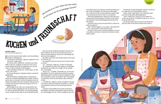 Tía Jenny und Juli stellten sich an den Küchentisch. Mit Händen und Füßen und einfachen spanischen Wörtern verständigten sie sich. Tía Jenny zeigte Juli, wie man einen Marmorkuchen zubereitet. Juli half, das Mehl und den Zucker abzuwiegen. Sie schnitt auch die Erdbeeren, mit denen sie den Kuchen dekorieren wollten. Bald schon stand der Kuchen im Ofen. Er roch köstlich!